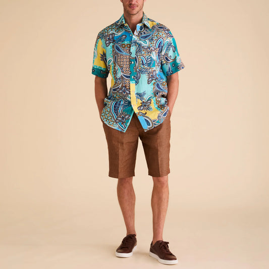Inserch Short Sleeve Mediterranean Paisley Print Linen Shirt