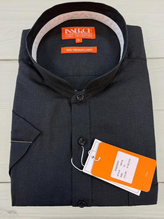 Inserch Short Sleeve Banded Collar Linen Shirt