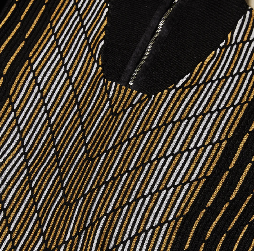 Half-zip pullover sweater with a geometric intarsia pattern.