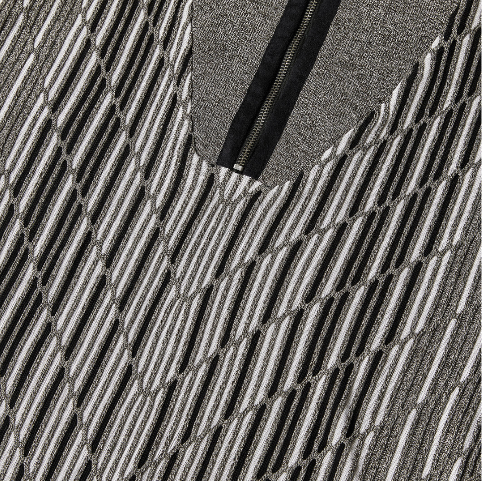 Half-zip pullover sweater with a geometric intarsia pattern.