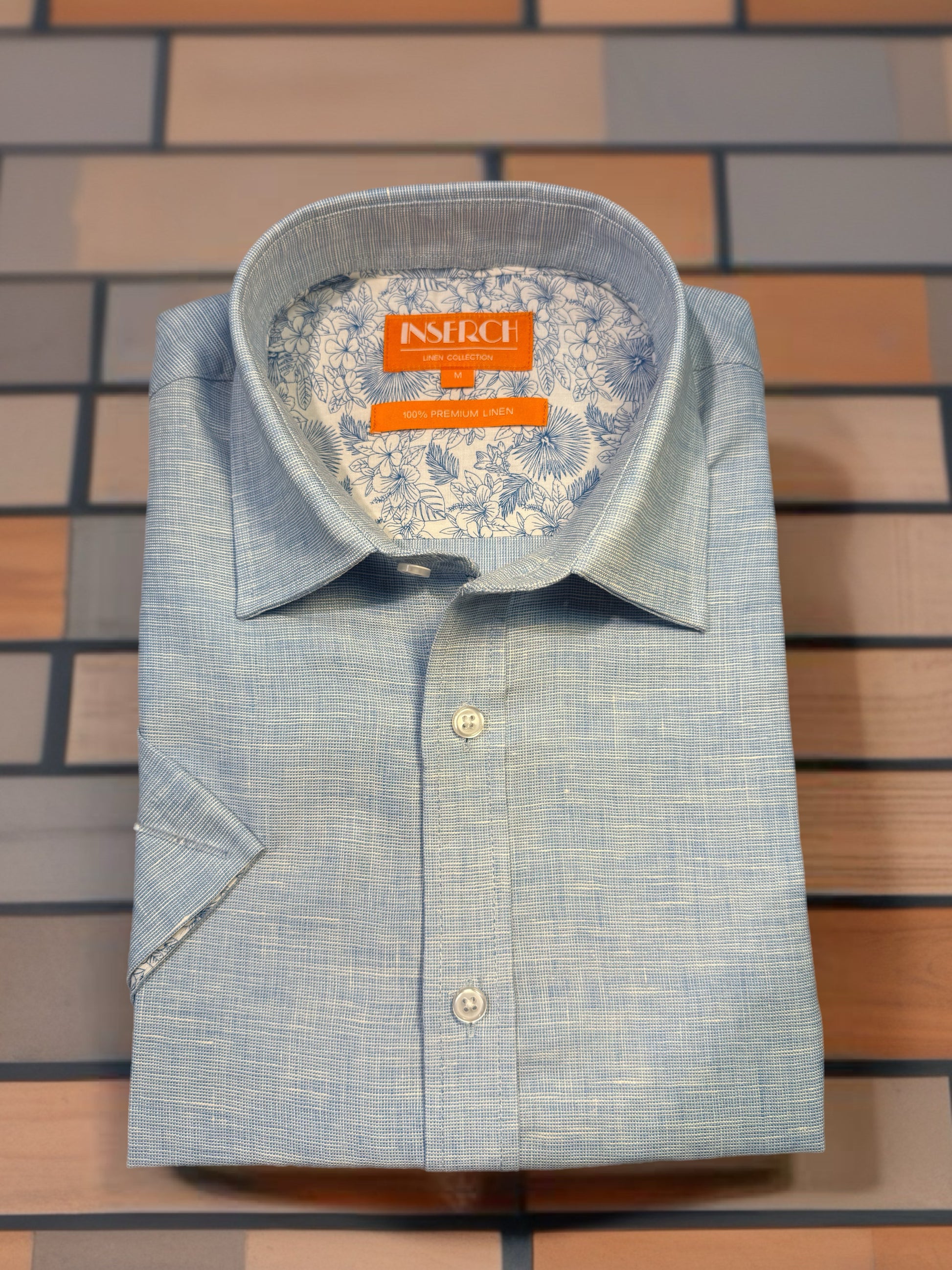 100% Premium linen short-sleeves shirt with cotton floral print trim details.