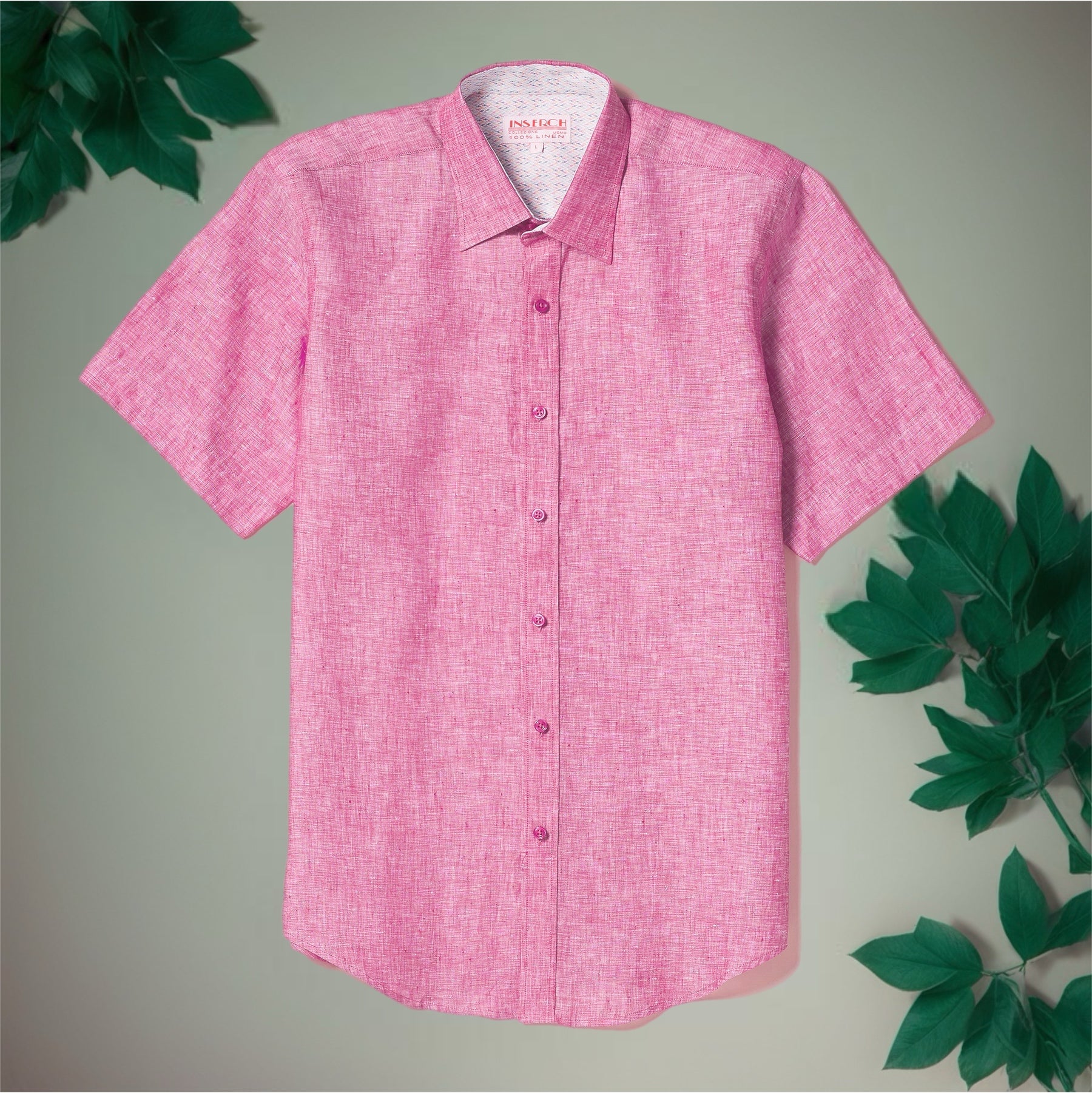 100% Premium linen short-sleeves shirt with cotton floral print trim details.